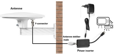 De antenne wordt gevoed door de ontvanger of een bijgeleverde adapter.