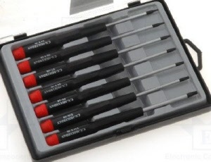 9-delige ESD-veilige, dissipatieve set precisie-schroevendraaiers met ergonomische handvatten en handpalm-draaikappen.