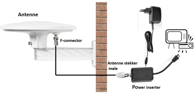 • Antenne wordt gevoed via de coaxkabel - Voeding: 100-230V naar 12V-200mA door bijgeleverde voeding / inserter (Binnen plaatsen) • Kabellengte tussen inserter en ontvanger: 20cm • Antenne connector: IEC Male ------------------->