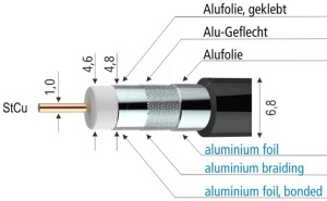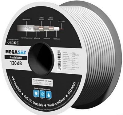 Specificatie: • Type: RG6 • Impedantie: 75 Ohm • Kern: 1.1mm CCS, staal / koper • Diëlectricum: 4.8mm, Foamed PE • Afscherming: 2x Aluminium, 2x Gevlochten 48 draadjes, >120dB • Mantel: PVC, Wit, 7.2mm, UV-bestendig • Velocity: 0.80 • Demping/100m: - 800MHz-17dB - 2150MHz-29dB • TÜV getest, brandbeveiligingsklasse Eca volgens BauPVO-EN 50575 |